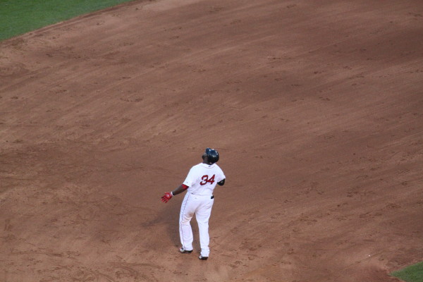 The Red Sox trailed heading to the ninth on Saturday. David Ortiz came to bat with the bases loaded and the Sox down by two, he doubled off the wall scoring three runs for the win. Once he got to second he started his celebration, yelling to the skies.