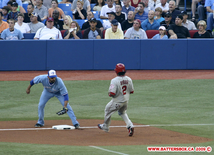 Erick Aybar of the Angels looks perturbed about having to return to second after Vladimir Guerrero fouled off a pitch during first inning action at the Rogers Centre August 21st. Jays second baseman Aaron Hill stays close to the bag.