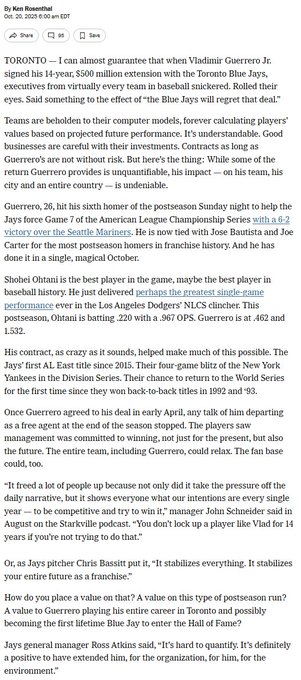 Vlad has had a post-season. For all post seasons with 40+ PA (Vlad at 47) his 462 average is 4th all time. His 532 OBP is 5th all time, 1000 slg is 2nd all time (Beltran 2022 is higher at 1022). This is out of 991 players. For all-time career Ernie CLement's 447 average is #1 (40+ PA), his 463 OBP is 9th. Vlad's 705 Slg% is 10th (remember he had those bad playoffs in 20/22/23). Vlad is one of 12 hitters with a 200 wRC+ lifetime in the playoffs. Delgado is #8 at 204, and ex-Jay Willie Aikens is #1 at 230 (who knew?).