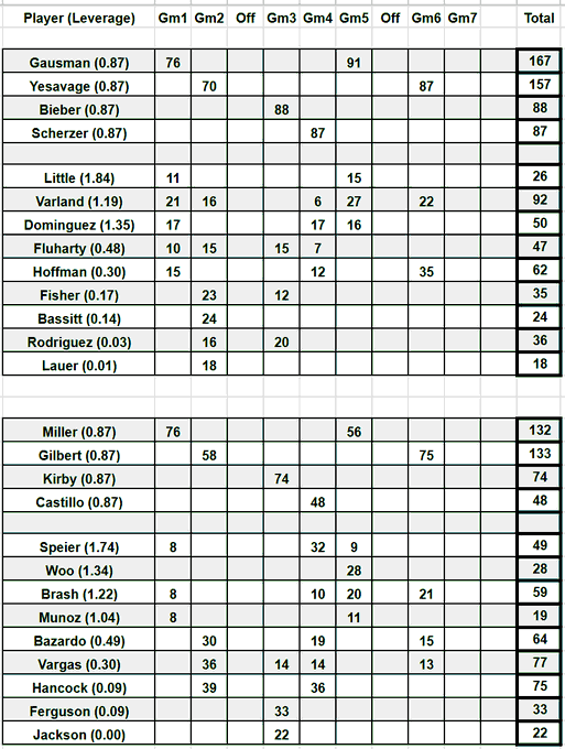Yeah, leverage tomorrow mostly doesn't matter. If you are losing by a bunch, still pitch as if it is tied as you don't need to save anyone. Even if you are winning by a bunch, with 3 days off to the World Series start, you basically don't need to save arms and should pitch as if tied too.