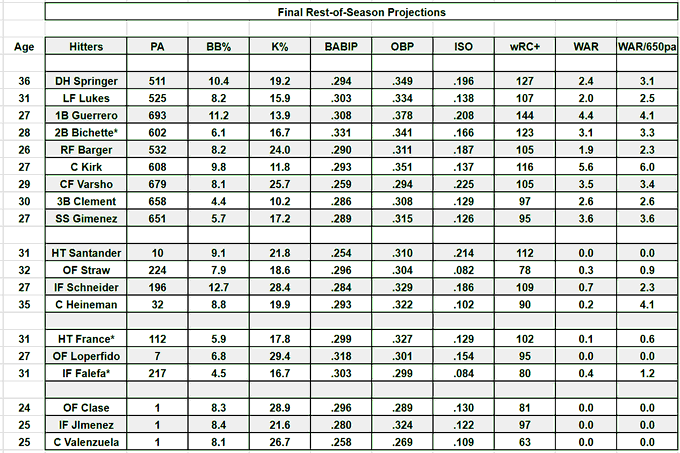 The projections will like change substantially by the start of next season, but I just wanted to gather up the final Fangraphs Combined Rest-of-Season projections for our roster heading into the offseason.