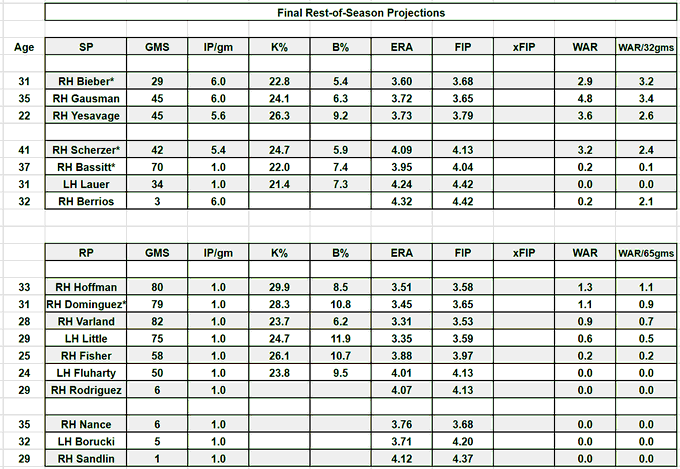 The pitching projections are a bit messier because the playing time projections get all weird, and also they don't really know how to handle guys that are both starters and relievers.......i think they key here is to just look at the ERA and FIP projections, and assume that they are projecting mostly on the role that they've been in for the most part, not for the role they might have. i.e. so even though Bassitt and Lauer are projected as relievers here, their actual stats projections are probably no different than if they were being slotted in as SP.